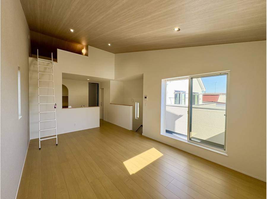 南ひな壇の立地を活かした2階リビングは、勾配天井による広々とした開放感と、南向きの豊かな陽光が特徴です。明るいリビングが、家族の団らんをさらに温かく彩ります。