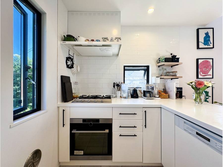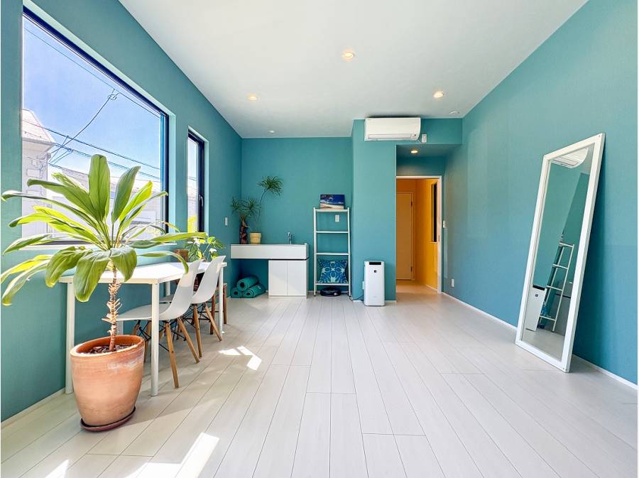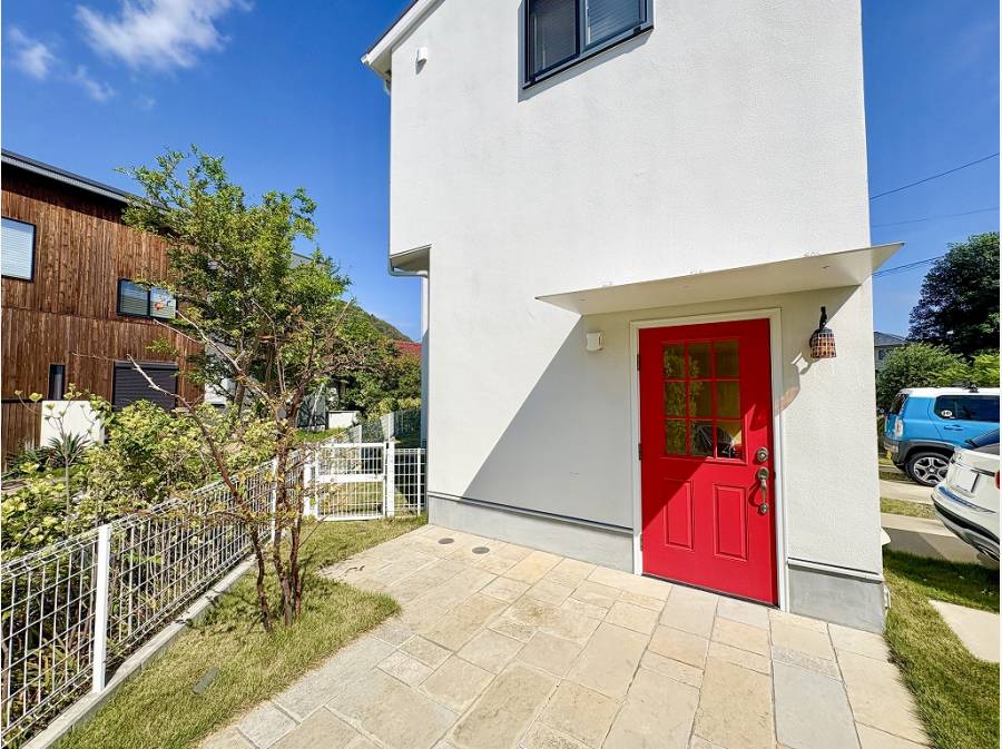 1階は鮮やかなレッドの扉の入口からも出入りができる仕様で、店舗や二世帯住宅としての利用も可能です。