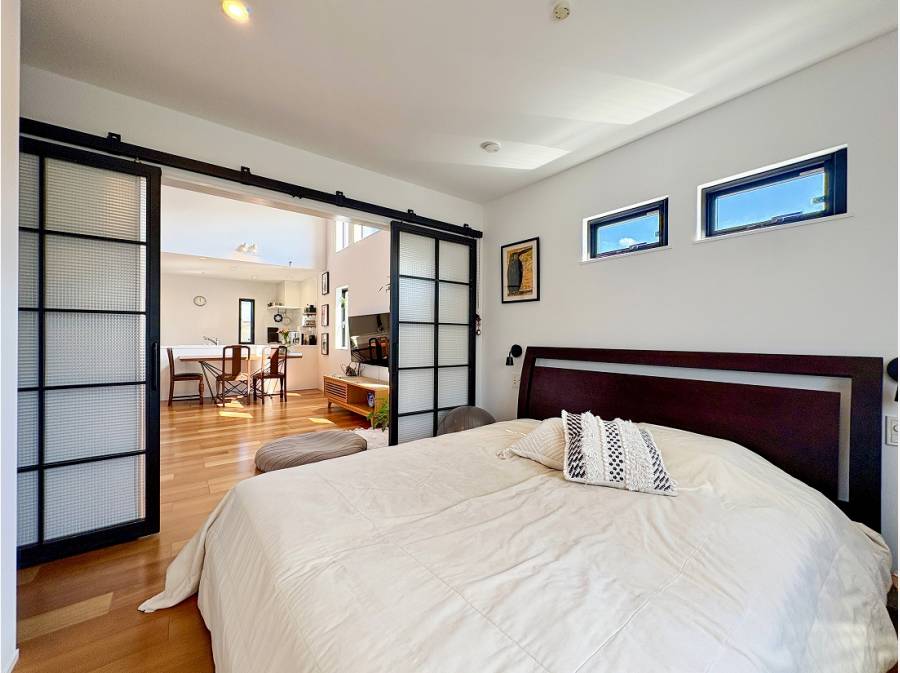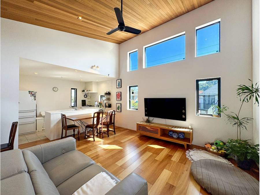 2階は無垢材をふんだんに使用した勾配天井のLDKと洋室。