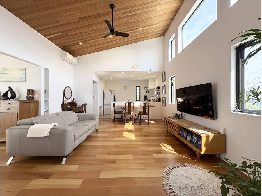 リビングでは、大きな窓からの景色を楽しみながら、心地よい時間を過ごせます。お月見も楽しめる開放感のある窓が特徴で、機能性とデザイン性を兼ね備えた住まいとなっています。