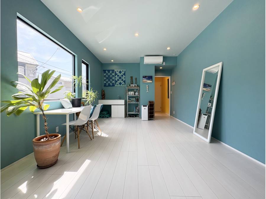 ターコイズカラーが印象的なお部屋は、ハワイを彷彿とさせ、フラやヨガの空間としてもぴったりな雰囲気です。