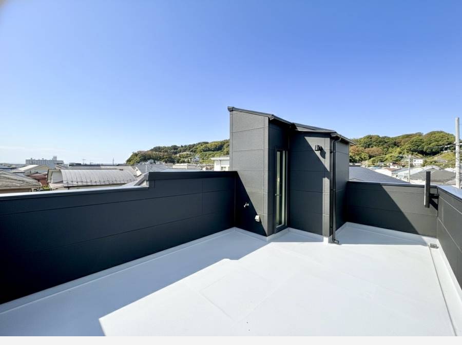 「逗子」駅から徒歩10分。広々とした11.8帖のルーフバルコニーと高さ2.8mの天井がもたらす贅沢な開放感。