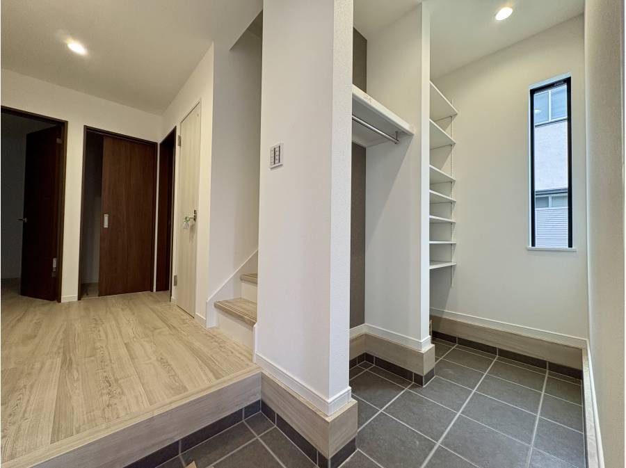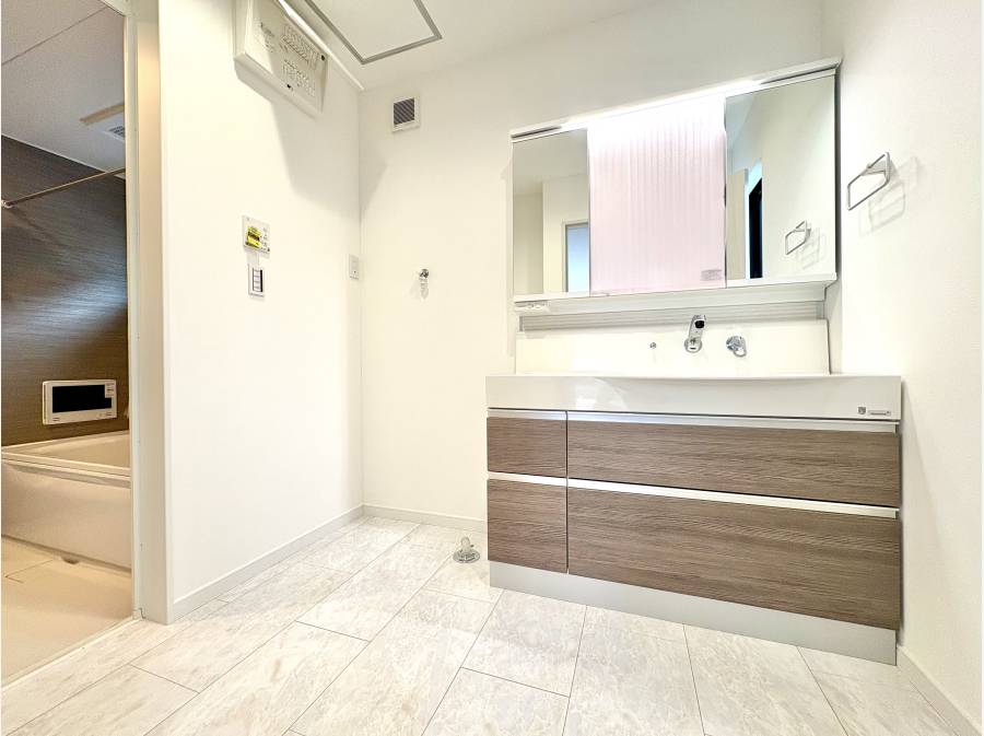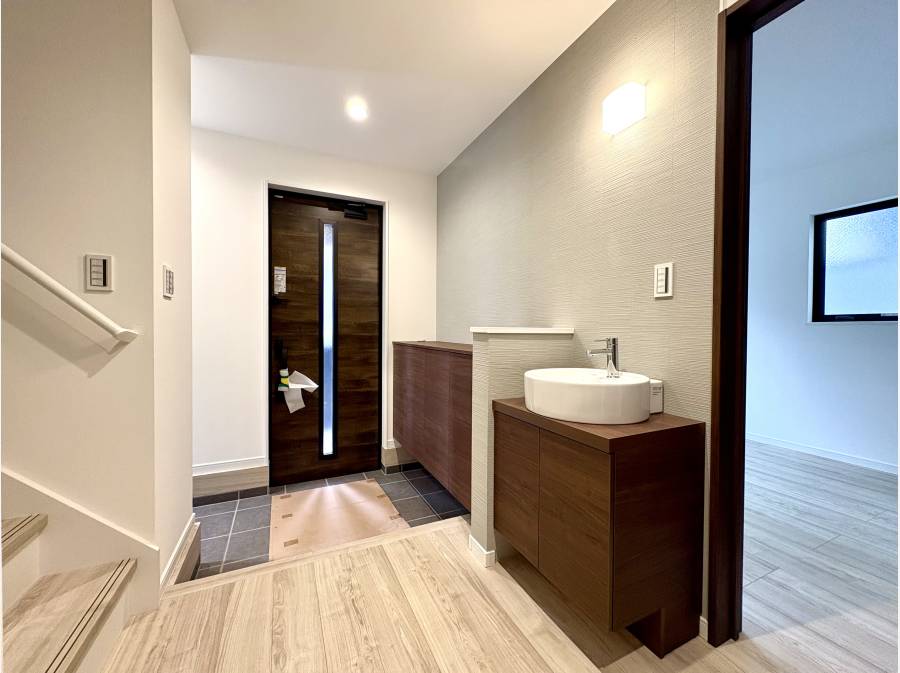 さらに、デザイン性と実用性を両立。洗面化粧台には「ツインボウル(ルミシス)」を採用し、玄関には便利な「サブ洗面」を設置。1階にはリモートワークに活用できるサービスルーム(納戸)も備えています。