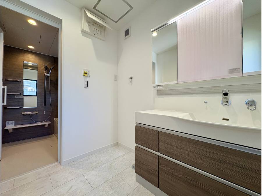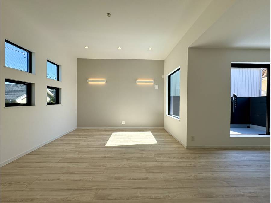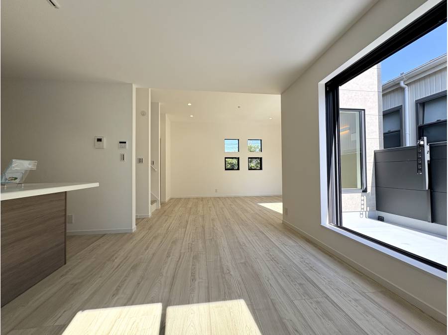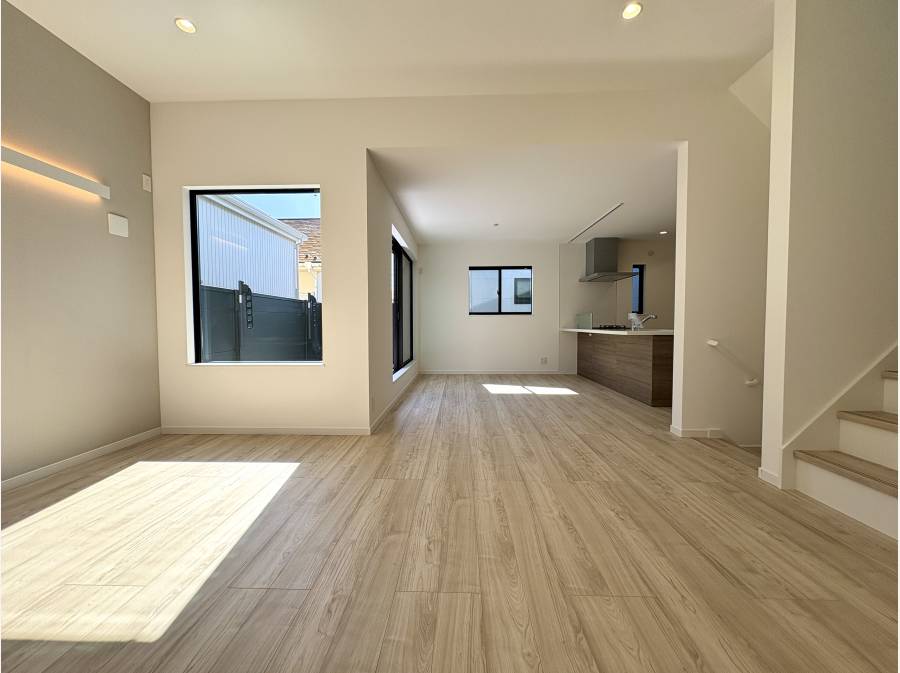 建物は土地面積125.17㎡、建物面積109.31㎡で、1階には洋室3部屋と収納スペースを確保。2階には天井高2.8mの明るいLDKを配置し、自然光がたっぷりと降り注ぐ開放的な空間を演出しています。風通しも良く、家族が笑顔で集える心地よいリビングです。
