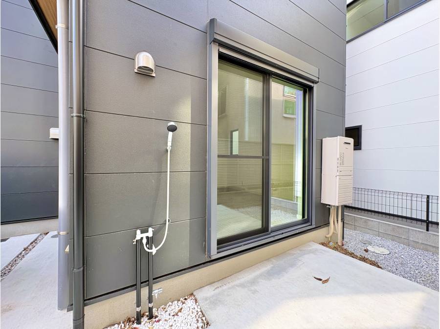 駐車場には、外シャワーを設置、海で遊んだ後の、帰宅の際にとても便利です。
