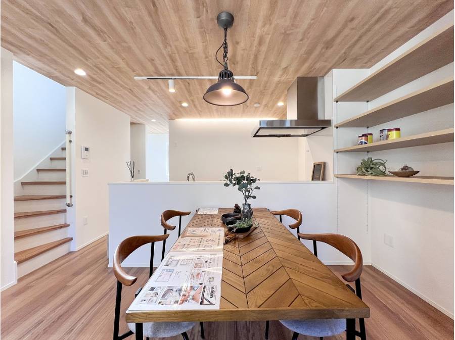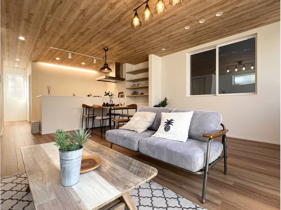 木目調のフローリングや天井がおしゃれなLDKは約22帖もの大空間。