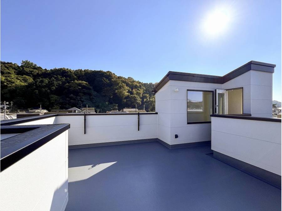 約13帖の開放的なルーフバルコニーから望む緑景に、桜のピンクが華やぐ春が待ち遠しいですね♪