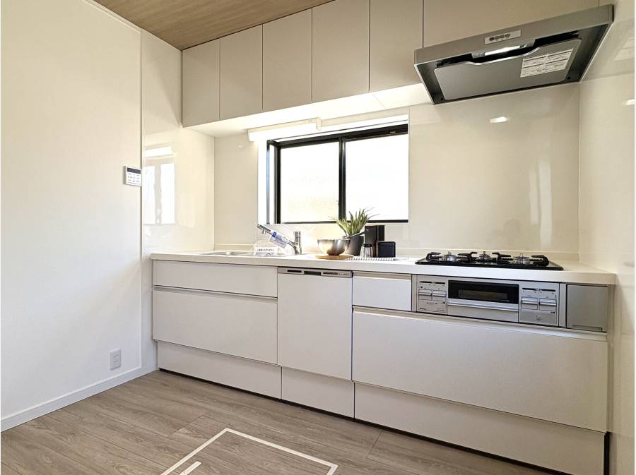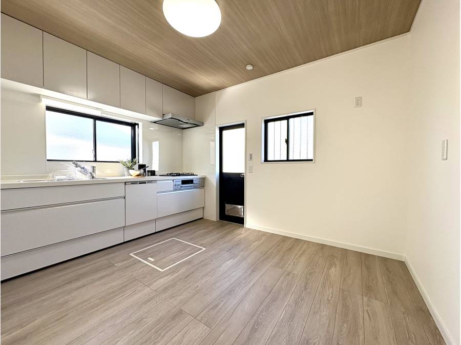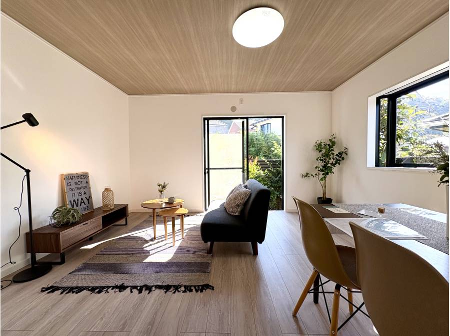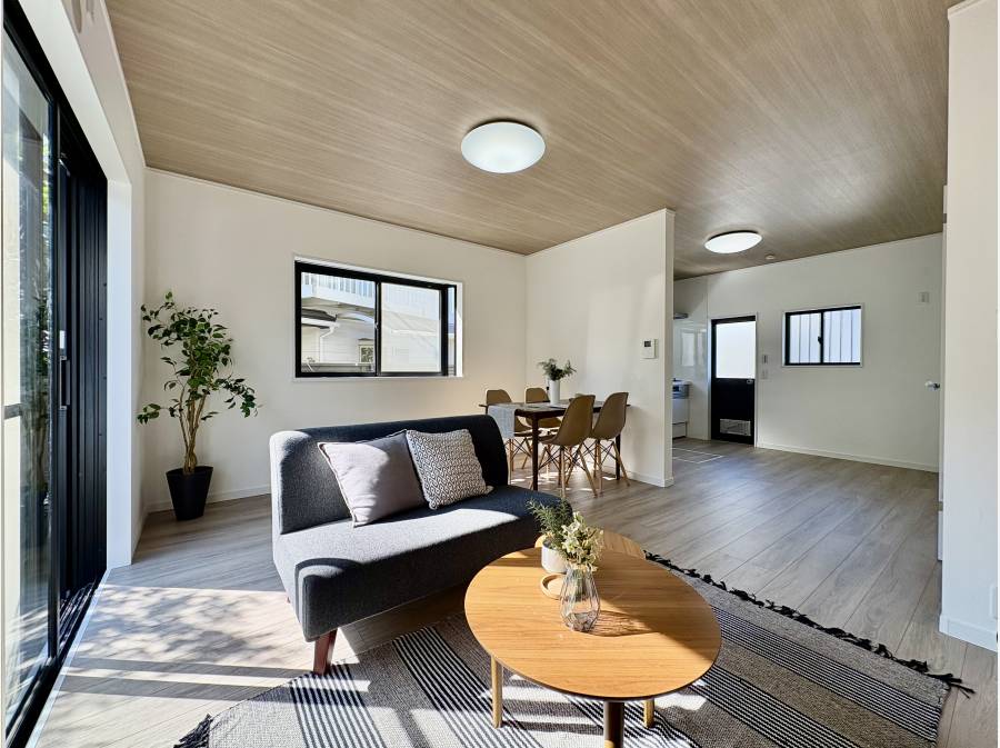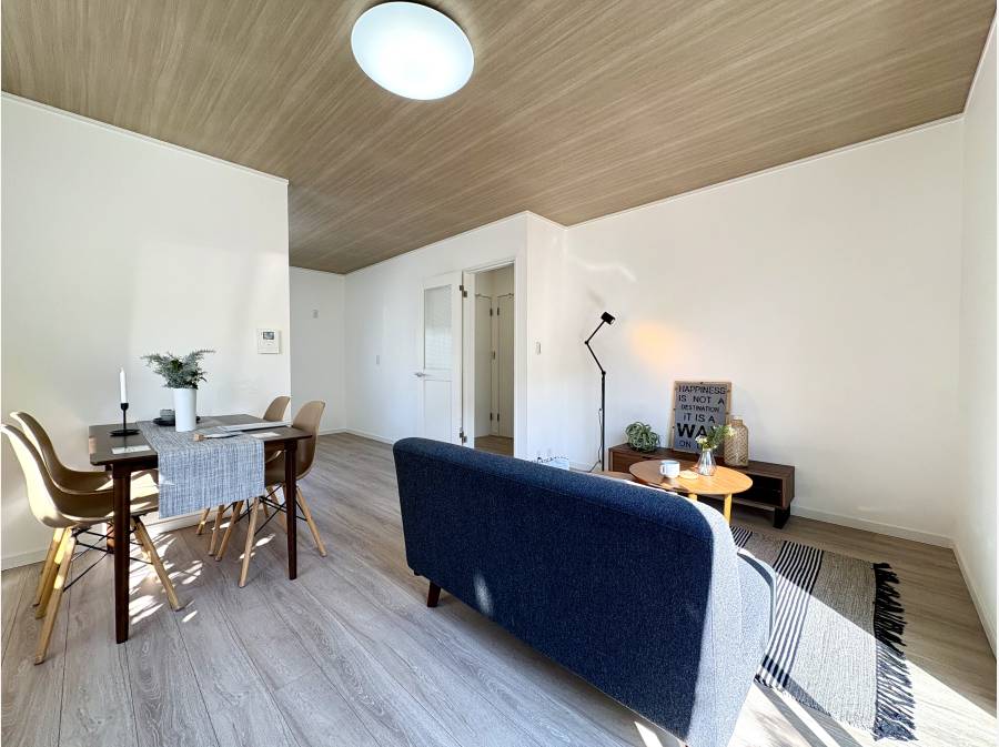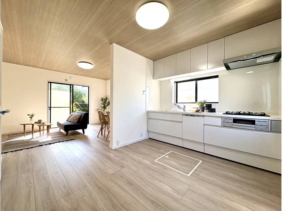 室内は「ホワイト×ナチュラルウッド」を基調としたデザインで、明るさと落ち着きを兼ね備えた空間に仕上がっています。約15.5帖のLDKをはじめ、キッチンや浴室、トイレ、洗面台などの水回り設備はすべて新品に交換済み。屋根や外壁塗装も行い、新築のような快適さで新生活を始められます。また、防蟻処理(5年保証付き)も施されており、安心してお住まいいただけます。