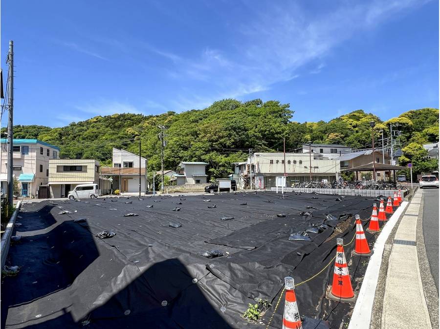 現地は三叉路の先端に広がるバス待合所に隣接している全3区画の土地。
