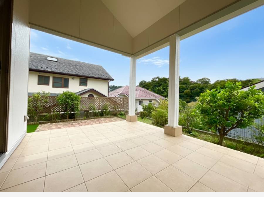 リビングとお庭を繋ぐテラスはゆったりお食事やBBQなども楽しめる開放的な空間。