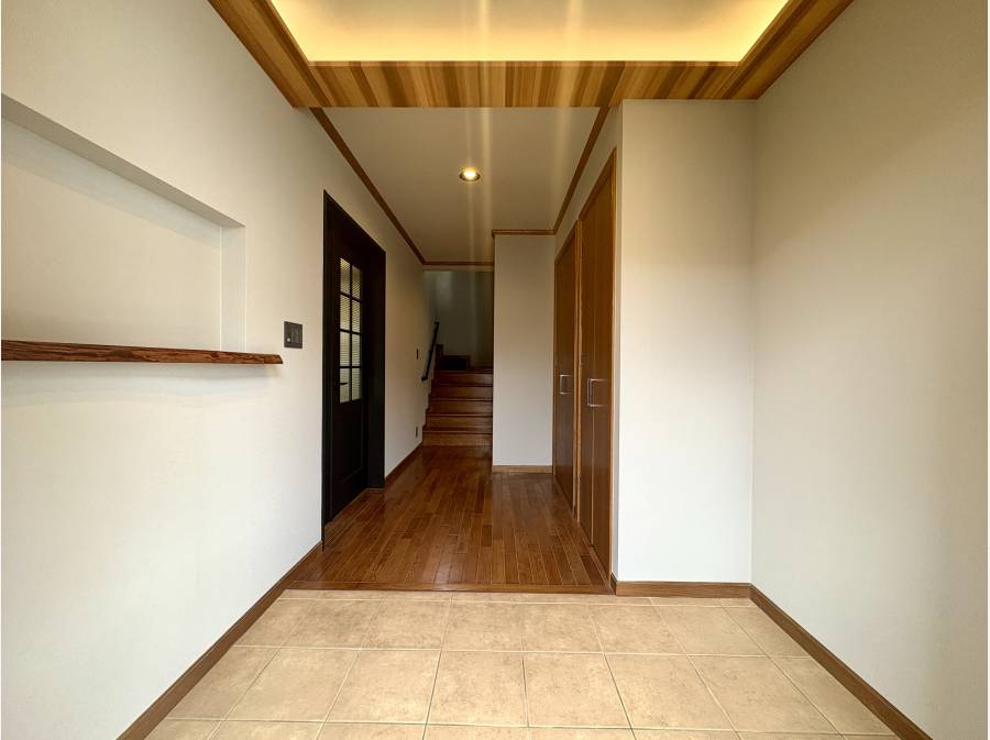 玄関を開けると、柔らかな木の温もりと穏やかな光が広がり、温かな空間が迎えてくれます。