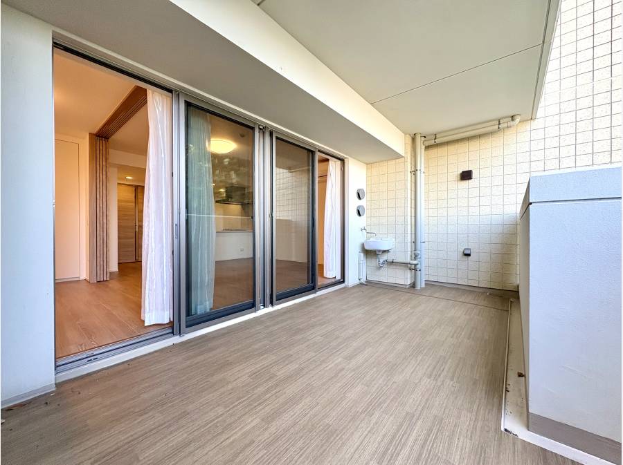 リビングから広がるバルコニー(計24.60㎡)からは、秋谷の穏やかな海をチラッと少しだけ望むことができます。