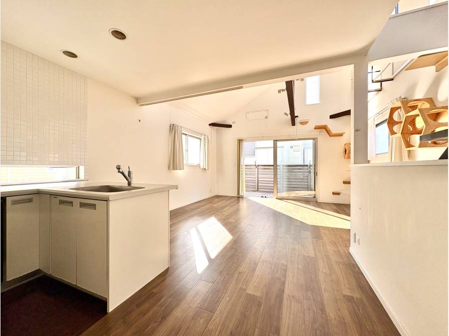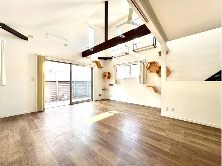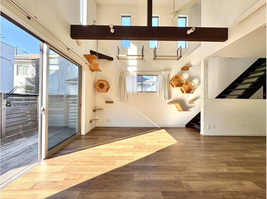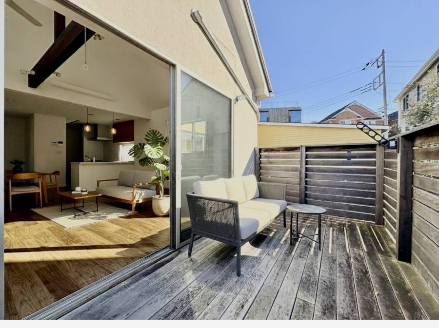 開放的なリビングの先にはウッドデッキが広がり、日差しがやさしく差し込む癒しの空間が広がります。