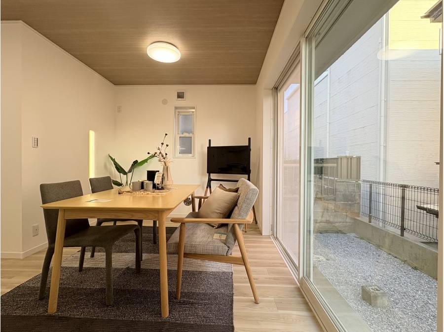 南向きのリビングは、陽光がたっぷり差し込む明るく快適な空間です。大きな窓が開放感を引き立て、家族の集いにぴったりの場所となっています。