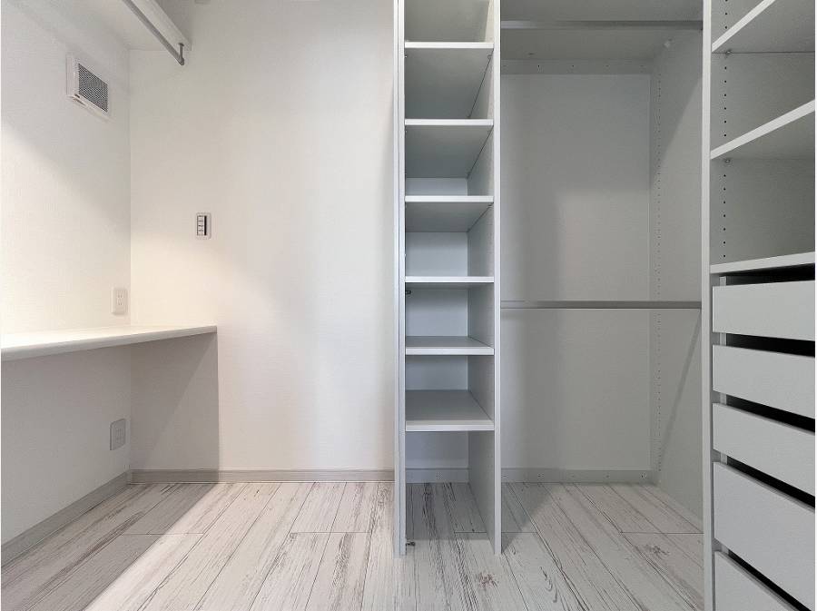 居室のウォークインクローゼット内にはカウンターなど工夫溢れ、<ただの収納>では終わらない機能美を追求したこだわりを感じます。