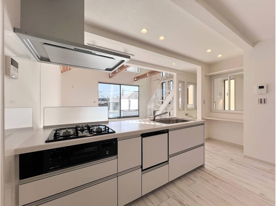 オープンキッチンからも空の青さを感じられ、家族みんなが居心地の良い時間を過ごせるでしょう。