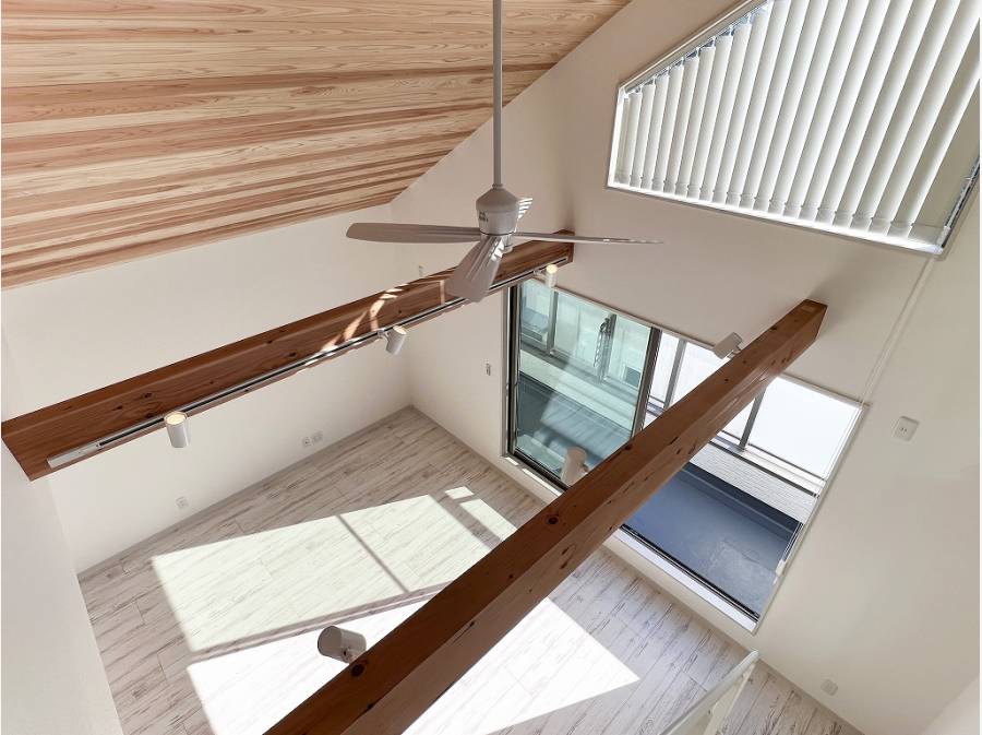 勾配天井には暖かみのある秋田杉が貼られ、シーリングファンや化粧梁が光溢れる空間に見事に調和♪