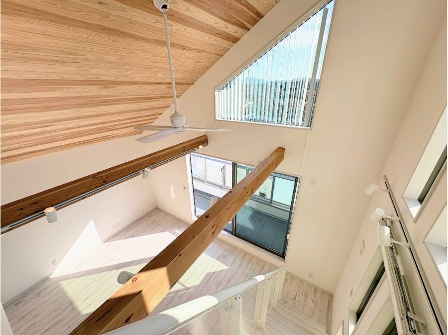 秋田杉の香り漂う勾配天井のLDKが魅力、逗子・久木の白亜のロフト付き住まい