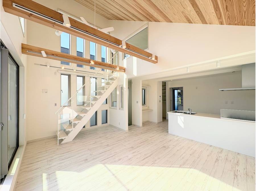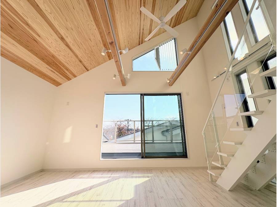秋田杉を使用した板張り勾配天井のLDKが特徴的で、木の香りと高窓から差し込む陽射しが心地よい空間を演出。家族の時間を温かく包み込みます。