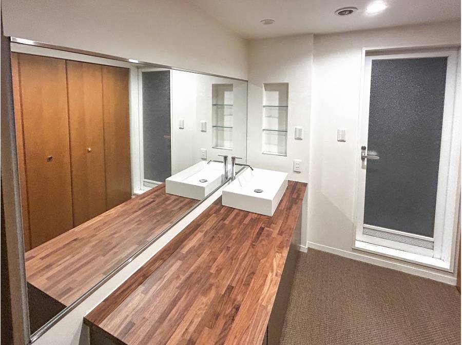 水周りは洗練感溢れ、特に洗面スペースは木の質感が優しく溶けこみ、何気ない身支度の時間も贅沢なひと時に。