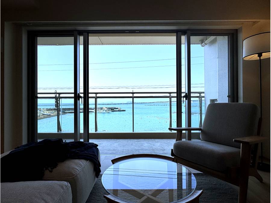 窓一面に広がる蒼い海と空。葉山らしい穏やかな景色を借景に、ゆったりとした時間が流れるオーシャンビューレジデンスです。