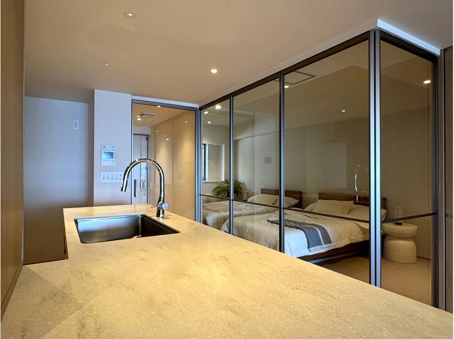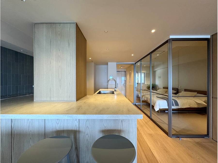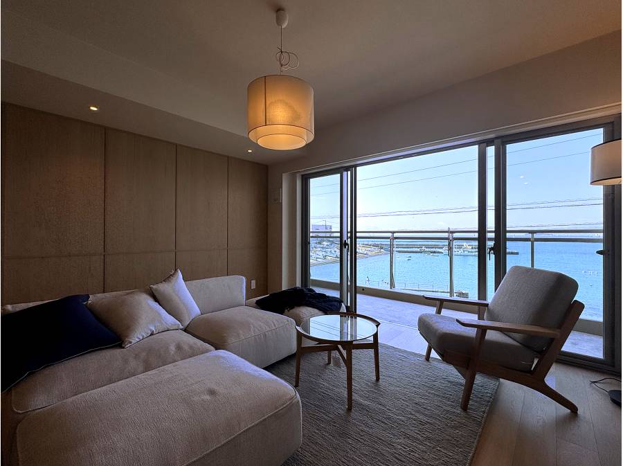 約25帖の開放的なLDKは、バルコニー越しに水平線を望む贅沢な設計。