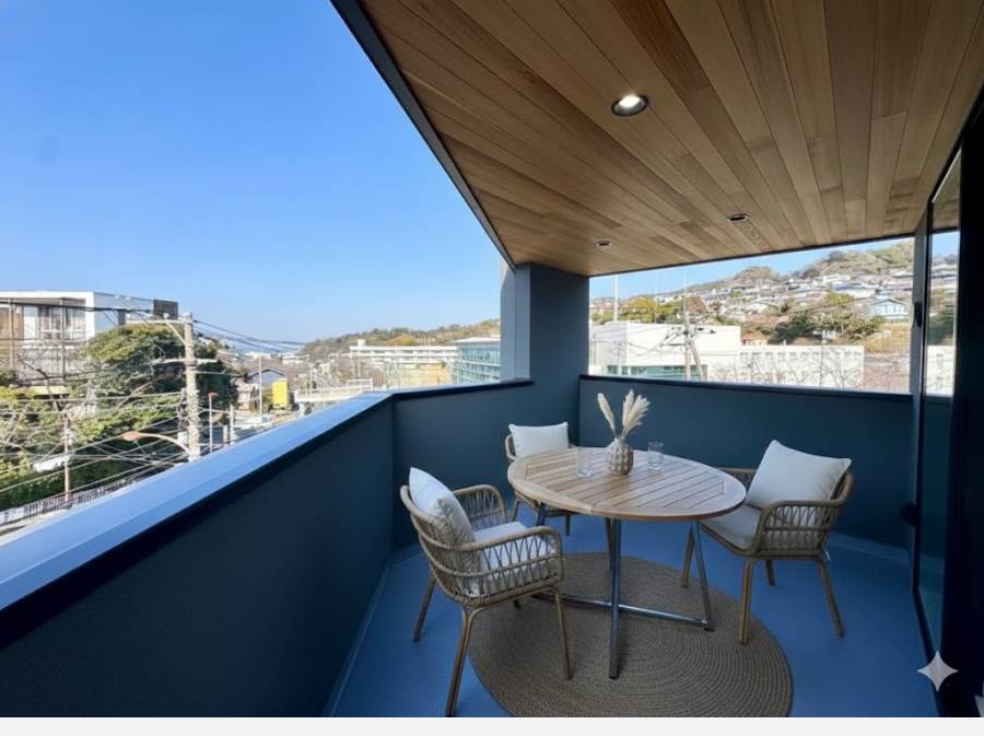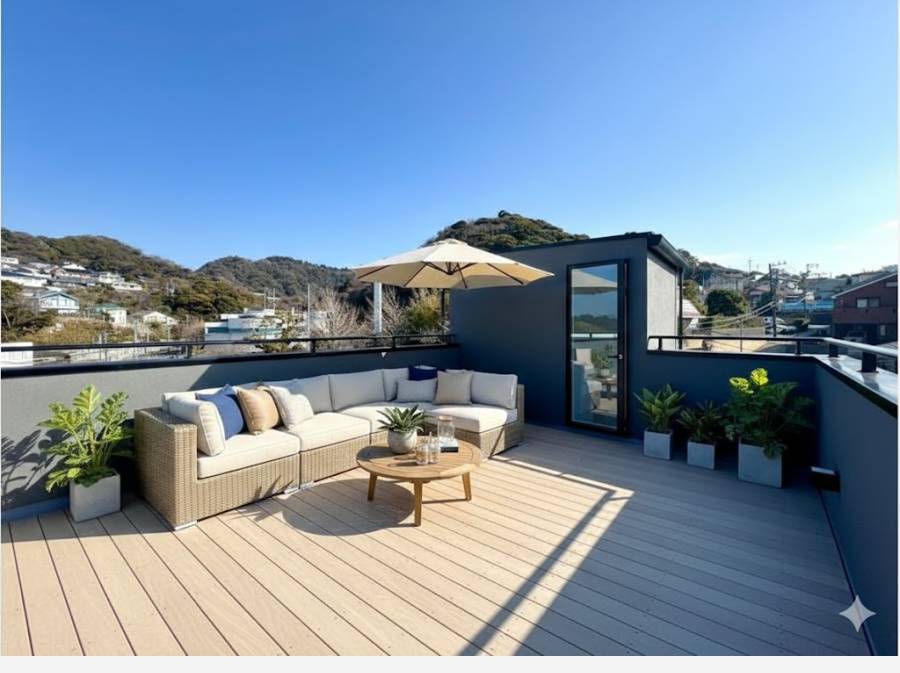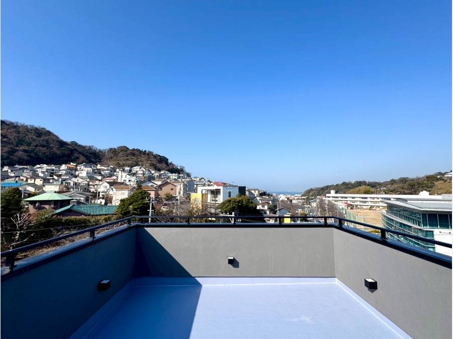 屋上のスカイバルコニーからは、青い海と緑の山々を一望できます。