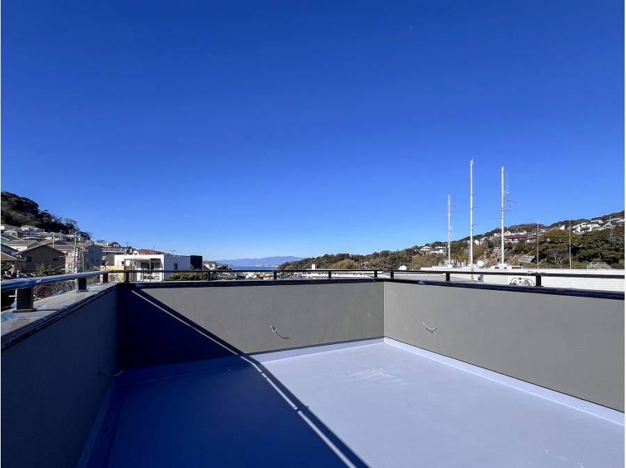 豊な緑の山々と海の景色が広がる屋上のスカイバルコニー。