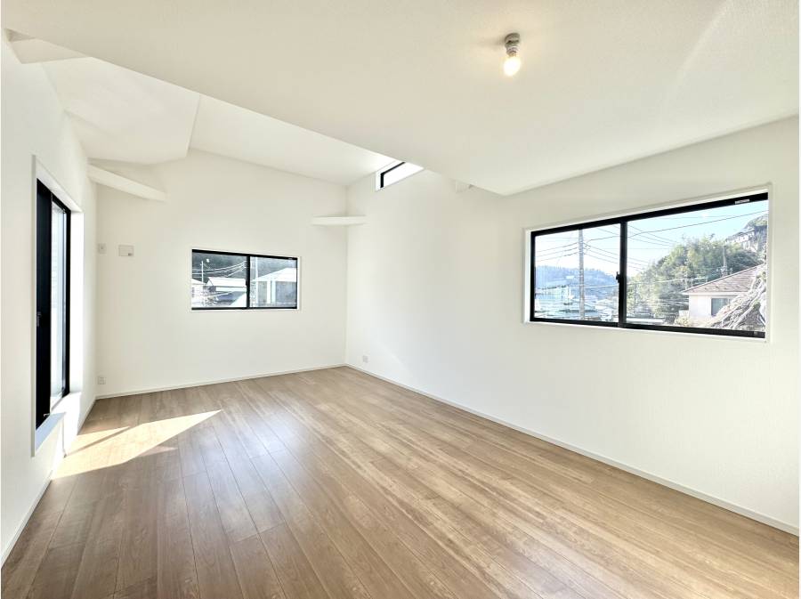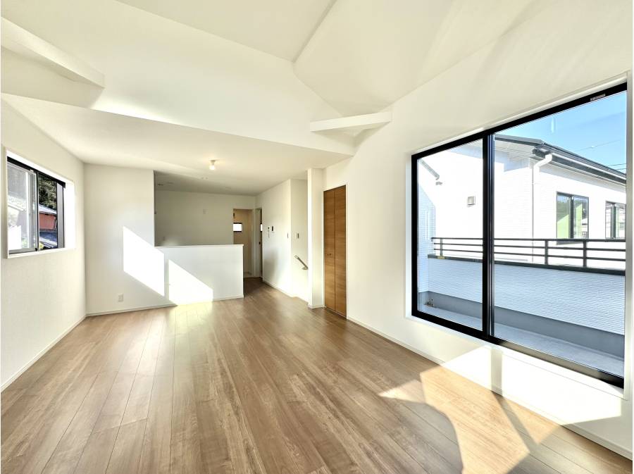 室内は白を基調としたナチュラルなデザインに、木の温もりを感じる床材を採用。勾配天井や多方向からの採光が、空間に開放感と奥行きをもたらします。