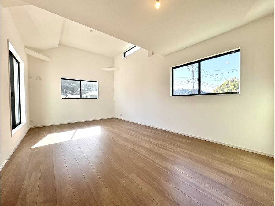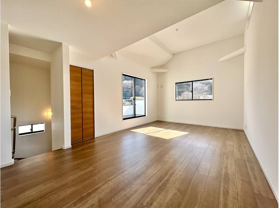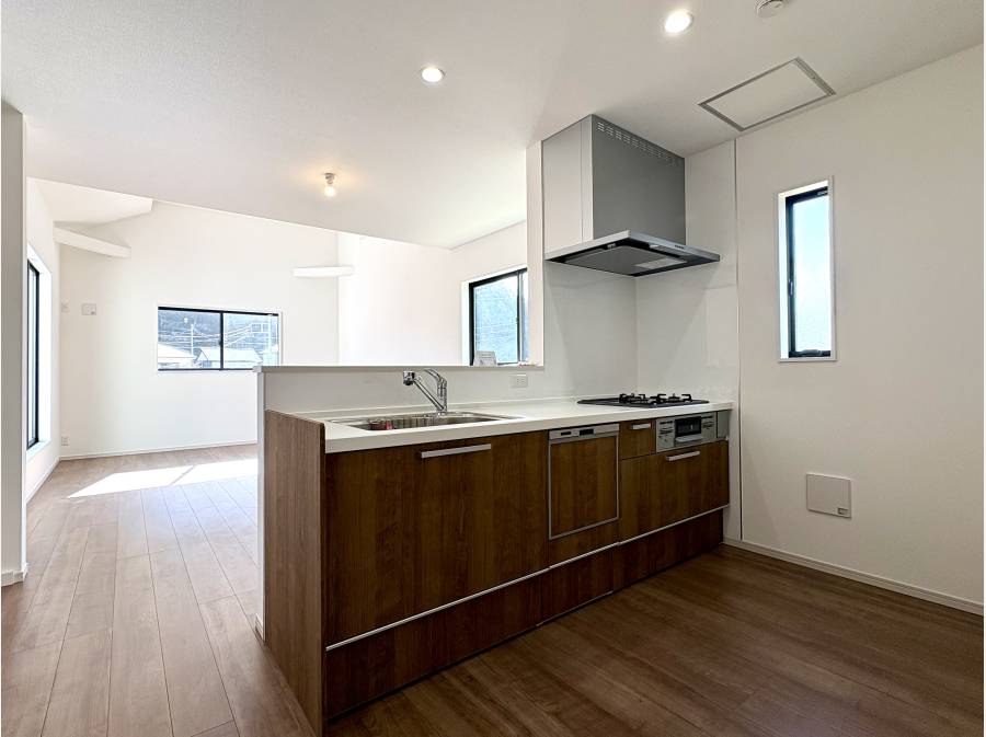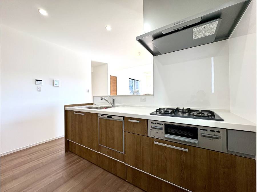 広々としたLDKは屋根形状を活かした一部勾配天井となっており、上部から差し込む光が空間をより明るく、心地よい雰囲気を演出します。また、フルフラットの対面式キッチンにはパントリーを備え、家族との会話を楽しみながら料理をすることができます。