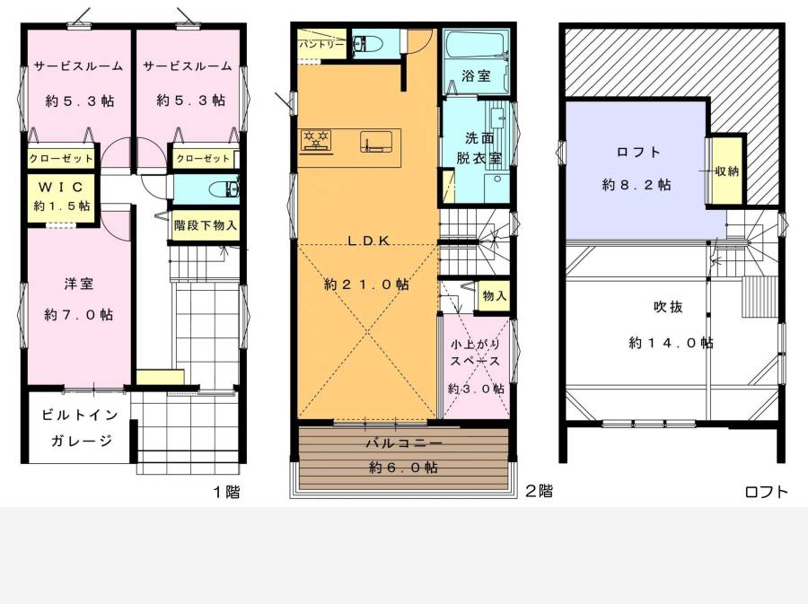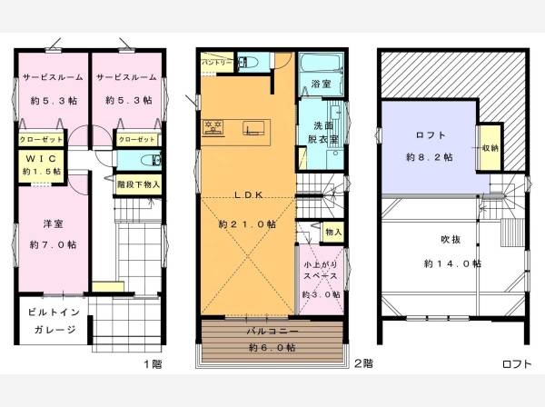 | 間取り | 1LDK + 2サービスルーム(5.3帖+5.3帖)+ロフト+ワークスペース+ウォークインクローゼット+パントリー 間取り・区画図を取り寄せる | 構造・階建て | 木造 地上2階 |