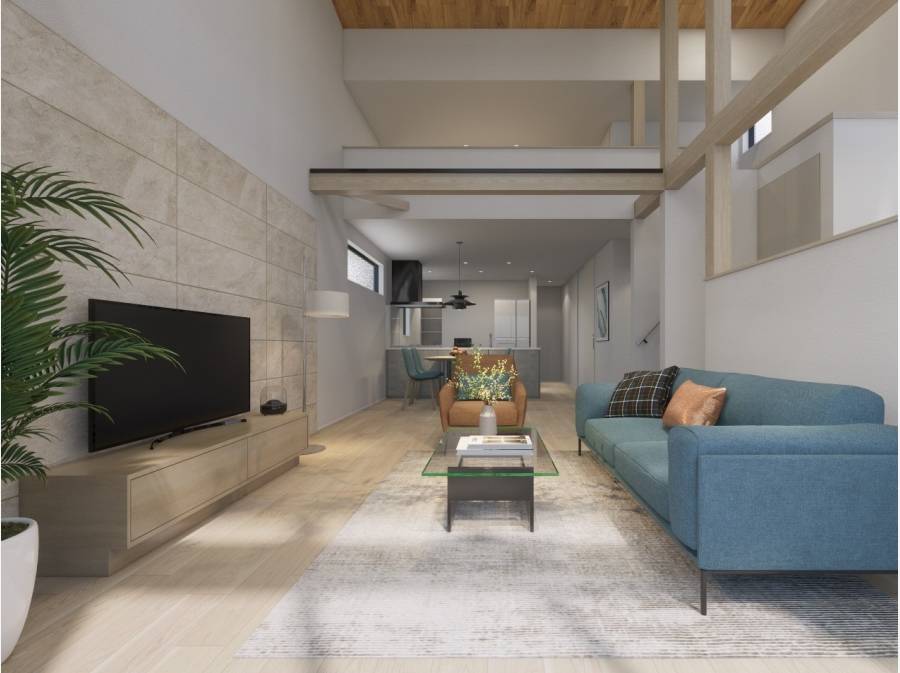 勾配天井の開放感に加え、小上がりスペースやロフトを設けた奥行きを感じる空間。