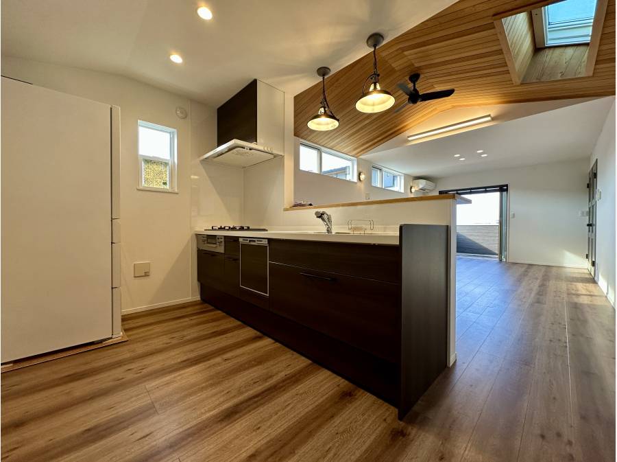 2階には水回りと、約19帖の上部勾配天井のLDKがございまして、開放感溢れる居住空間が広がります