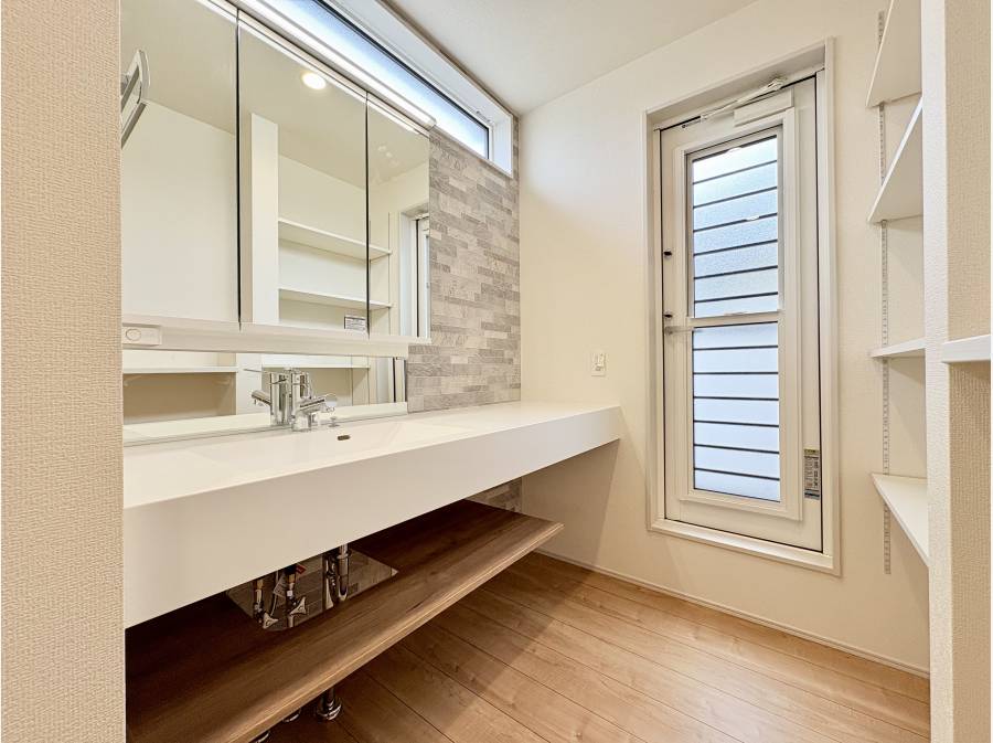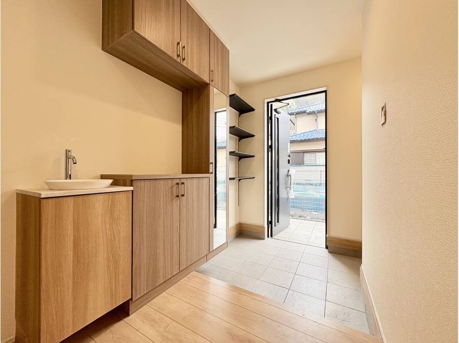 1階玄関には土間収納やシューズインクローゼット、手洗い場を配置し、日々の暮らしを快適にサポートする設備が整っています。