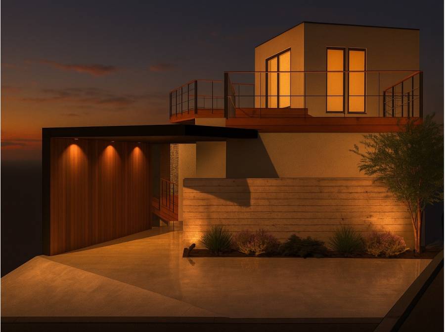接道から少し下がった場所に宅地が広がり、立体的なアプローチが住空間に奥行きをもたらします。