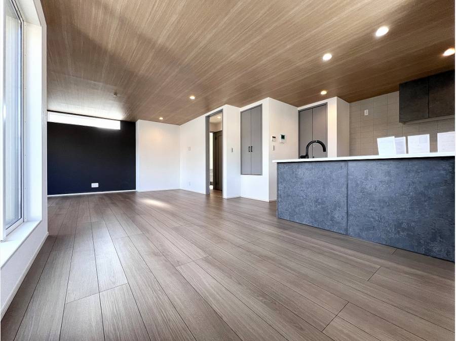 板張りの天井やアクセントクロスが見事に調和した明るいLDK。