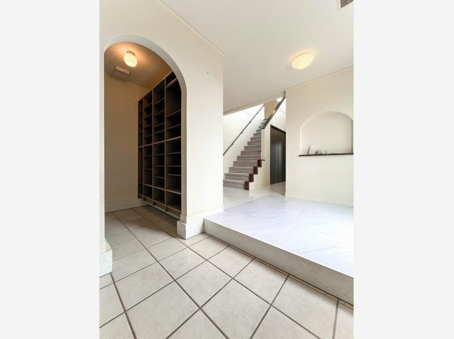 大理石調の床材が映える伸びやかなエントランスには大容量のシューズインクロークが寄り添います。