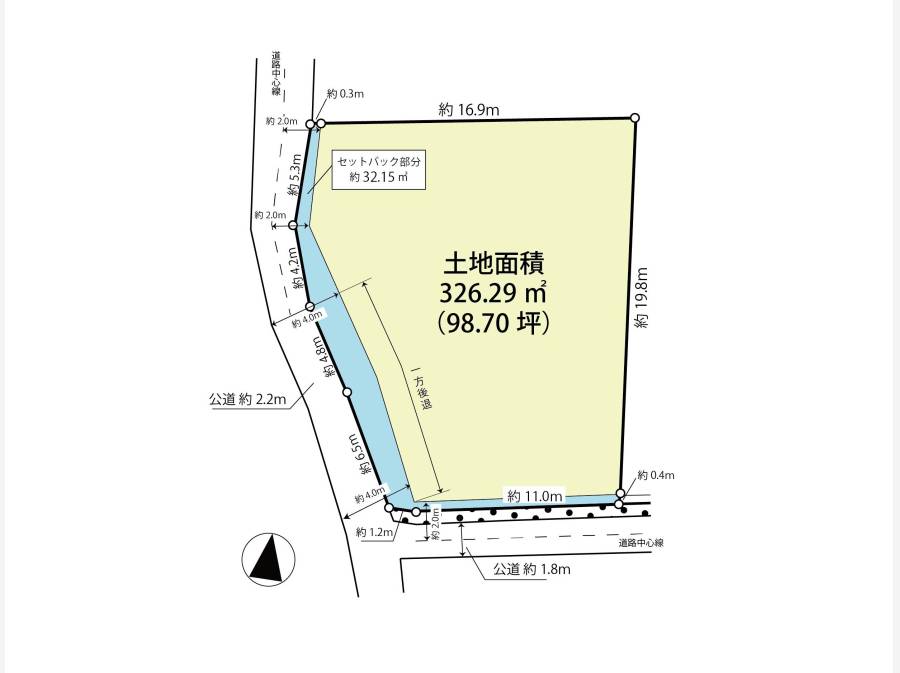 土地面積は326.29㎡(約98.70坪)。南西側の道路に面しており、陽当たりが良く、開放的な環境です。