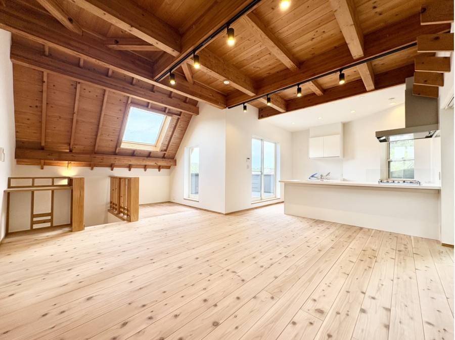 天井・床に無垢材、壁に珪藻土の塗壁を採用したこだわり仕様。