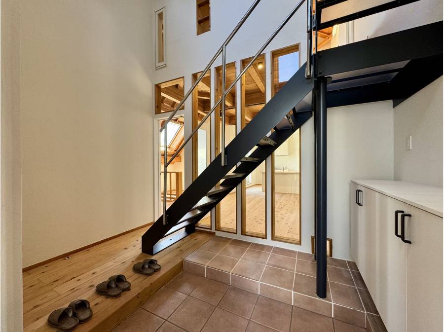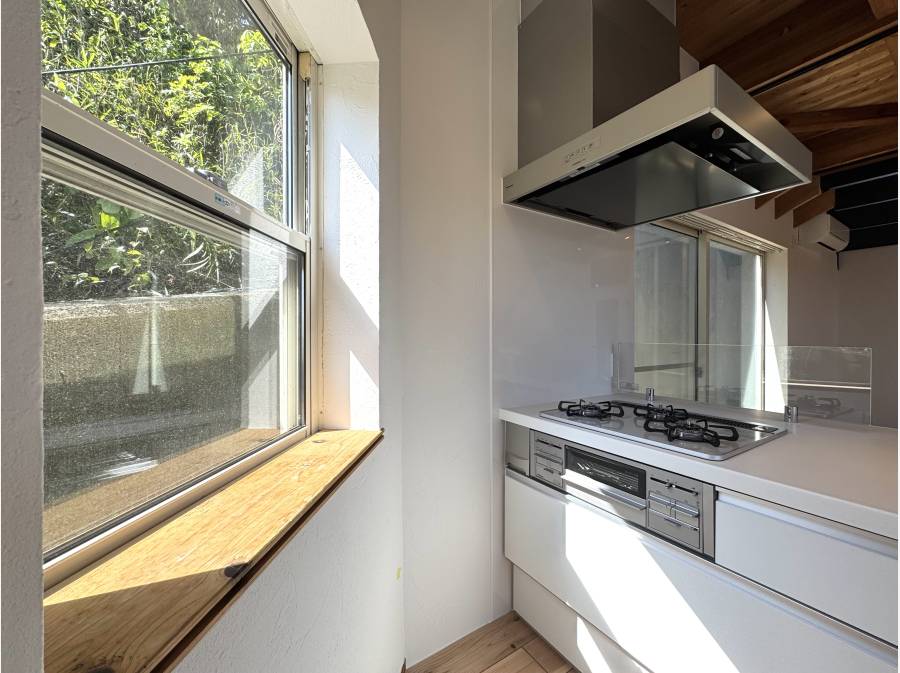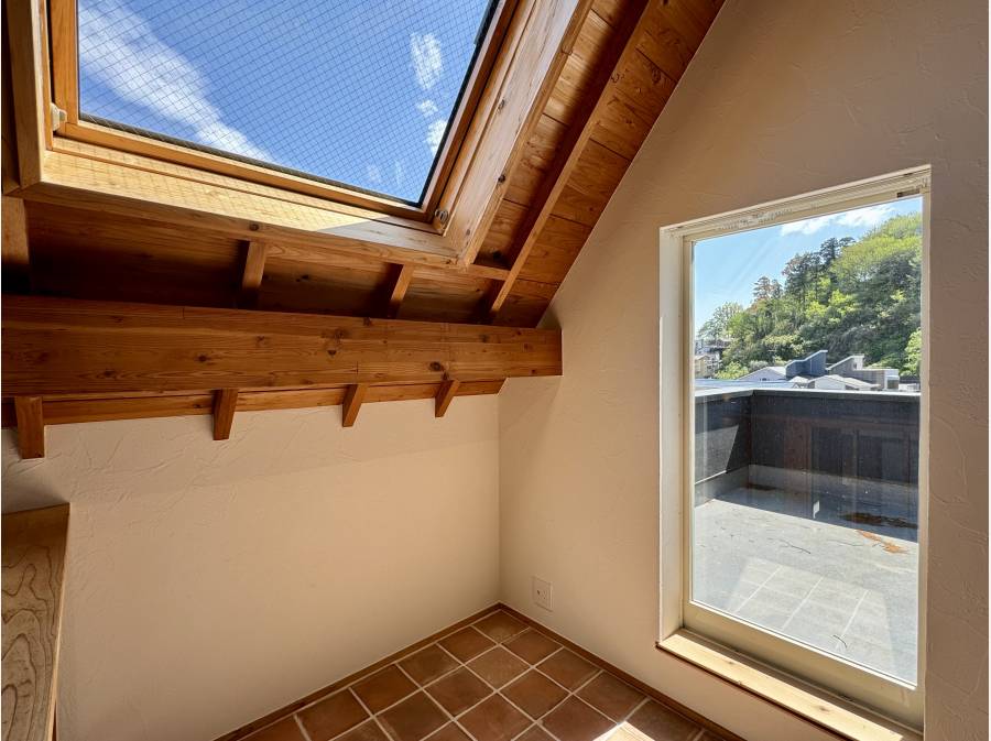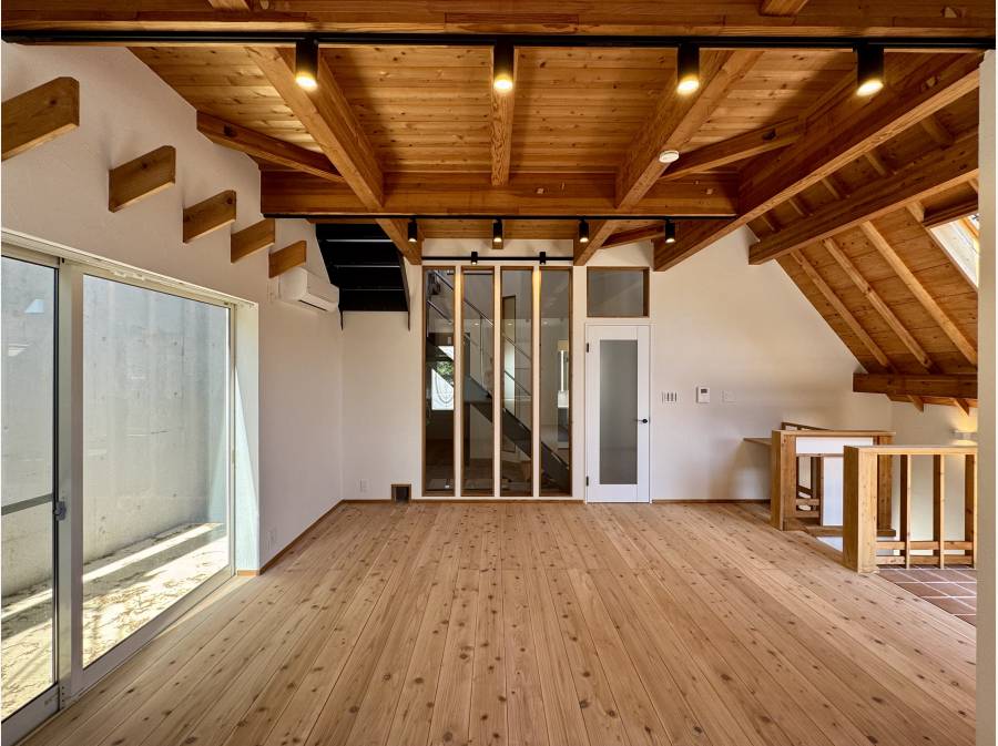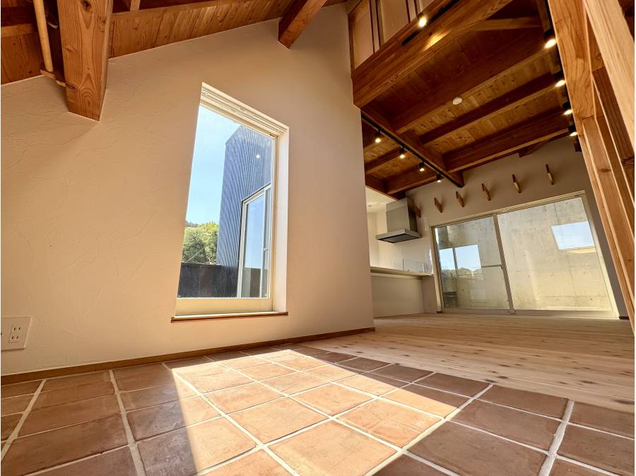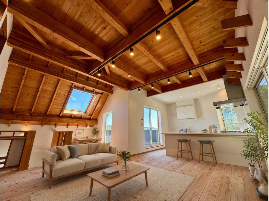無垢材の天井が広がる開放的なリビングは、光と木の温もりに包まれた心地よい空間。勾配天井とロフトが生み出す立体的な広がりが、日常にゆとりと遊び心を添えます。大きな開口部の先には、青空と街並みを望む抜け感のある眺望が広がり、朝のコーヒーや夕暮れのひとときを特別な時間へと変えてくれます。キッチンからはリビング全体を見渡せる設計で、家族との会話も自然と弾むレイアウト。外とのつながりを感じながら、自分らしい暮らしを描ける一邸です。