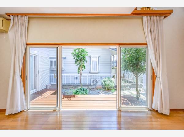 リビング掃き出し窓から伸びるデッキとお庭は南向きで日当たり良好